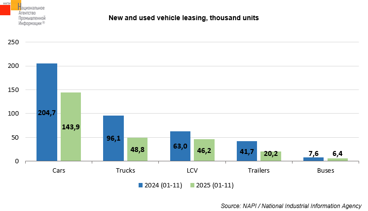 According to the marketing agency NAPI, 265.5 thousand new and used vehicles were purchased through financial and operational leasing in January-November 2025, which was a 35.7% decline on the similar period of 2024. Of them, 188.6 thousand new vehicles (-45.4% on last year) and 76.9 used thousand vehicles (+13.4%) were leased.