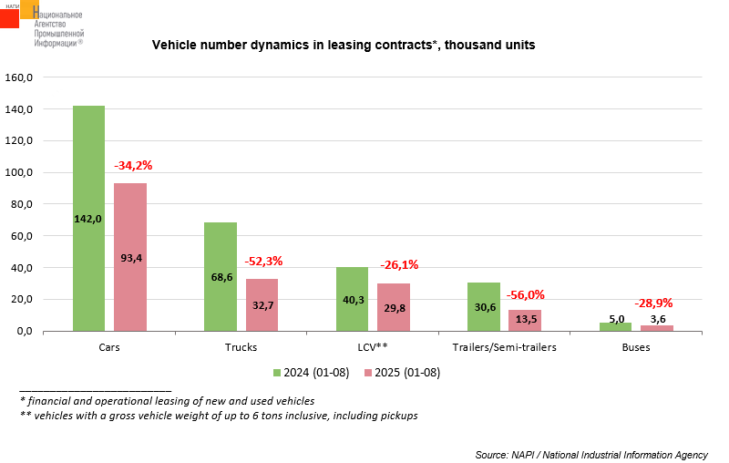 According to the marketing agency NAPI, 172,900 new and used vehicles were leased through financial and operational leasing over the first eight months of 2025, which was a 39.6% decline on the previous year. Following results of January-August last year, 286,500 units were leased. The largest leasing decline took place in the segment of trucks (-52.3%) and trailers (-56.0%).