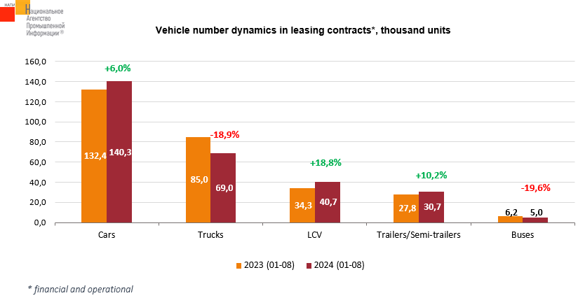 According to the marketing agency NAPI, 285.6 thousand new and used cars and commercial vehicles were issued for financial and operational leasing in January-August 2024. A year earlier, almost the same number of vehicles were issued for leasing - 285.7 thousand units. The segments of light commercial vehicles (LCV) and trailers became the leaders by leasing rates growth.