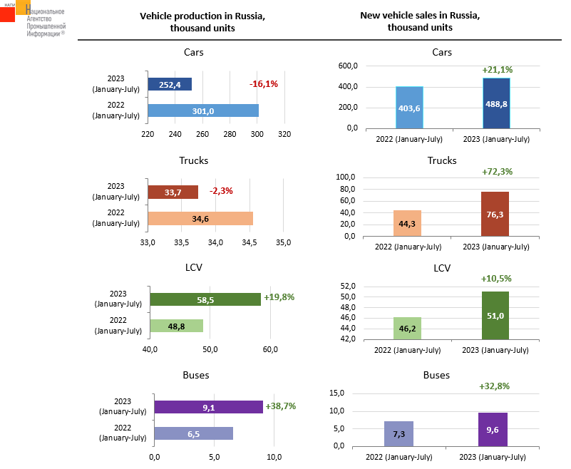 The marketing agency NAPI analyzed data on the new vehicle production and sales for 7 months of 2023. The car market increased by 21.1% on January-July last year, while the car production fell by 16.1%. New truck sales soared by 72.3%, while the truck production decreased by 2.3%. This situation in the car and truck segments is caused primarily by the rapid growth of import of Chinese vehicles. Production in the LCV and the bus segments grew faster than sales.