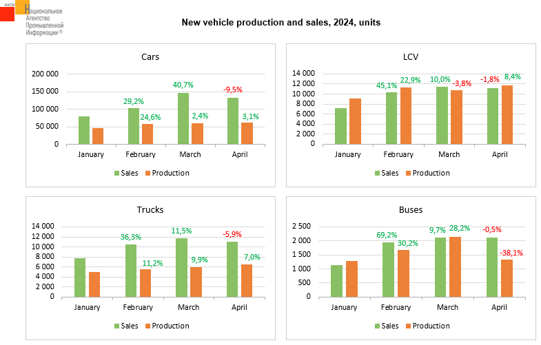 According to the marketing agency NAPI, in January-April 2024, car production increased by 67.4% on the similar period of the last year. Over 4 months of the current year, 224.8 thousand cars were produced. New car sales grew at a faster pace, the market was up by 88.3%. LCV production increased by 38.9% and reached 43.0 thousand units. Sales grew more significantly - by 49.1%. The truck production increased by 10.6% and reached 22.9 thousand units, the market grew by only 5.2%. Bus production was up by 33.4% and reached 6.4 thousand units. Growth of bus sales was almost the same (+33.0%).
