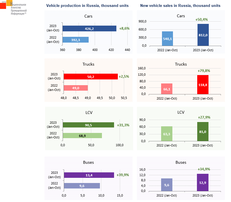 The marketing agency NAPI analyzed data on the new vehicle production and sales for 10 months of 2023. The car production increased by 8.6% on January-October last year, while the car market grew by 50.4%. New truck sales soared by 79.8%, but the truck production grew only 2.5%. The similar situation in the segments of cars and trucks is caused primarily by the rapid growth in import of Chinese vehicles. The production in the LCV and bus segments grew faster than sales.