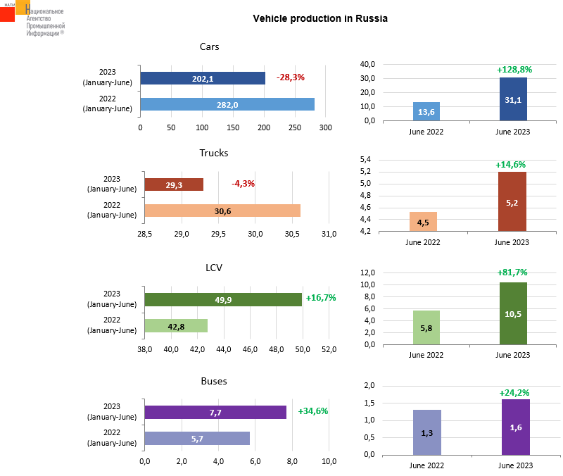 Compared with the first half of 2022, the production of light commercial vehicles and buses increased by 16.7% and 34.6%, respectively. The production of cars fell by 28.3%, the production of trucks - by 4.3%. If the results of June of the current year are compared with those of the similar period of the last year, the production of all vehicle types has increased.