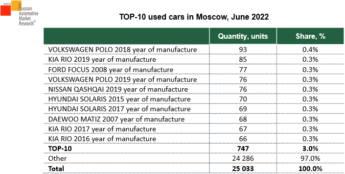 According to the data of NAPI (National Industrial Information Agency), 25.0 thousand used cars were sold in Moscow in June 2022, which was 4.2 times more than the amount of new cars sold (5.9 thousand new cars were sold).