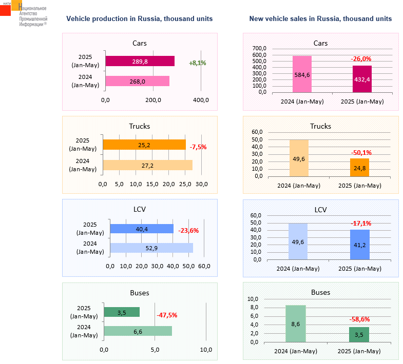 The marketing agency NAPI analyzed data on the production and sales of new vehicles in January-May 2025. In the period under review, only car production increased, but the growth rate fell compared to the results of January-April, +8.1% and +12.2%, respectively. The commercial vehicles production was down. Truck production decreased by 7.5%; following results of four months of 2025, its decline was not so sharp (-6.8%). The truck market fell by 50.1% in January-May. In January-May of the current year, the bus production did not decrease as much as new vehicle sales. LCV* production fell more than the market.