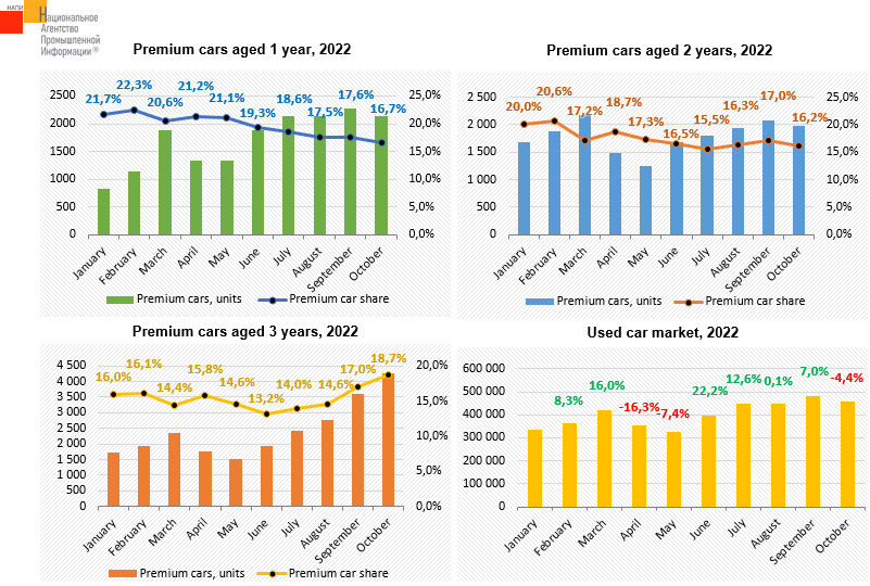 According to the NAPI (National Industrial Information Agency), 4.03 million used cars were sold over ten months of the current year. From June to October, sales of three-year premium* cars grew. For this reason, the share of premium cars in the sales structure of "three-year-old cars" also grew, so by the end of October, the share of "premium“ cars in this segment reached 18.7%. In the period from July to October, sales of premium one-year cars varied at the level of 2.1-2.3 thousand units per month, there was no steady growth during this period. Consequently, parallel import has not yet led to a significant sales increase in the segment of one-year premium cars, as well as in the new car market.