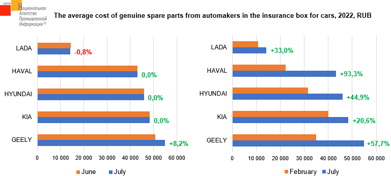 The marketing agency NAPI (National Industrial Information Agency) analyzed the prices for genuine spare parts from automakers in the insurance box for cars. It is interesting to note that of the most popular brands presented on the chart, in July, only average prices for spare parts for Lada cars slightly decreased on June. Average prices for Geely spare parts increased by 8.2% and almost returned to the May level. In July, prices for spare parts for other cars remained unchanged on June. In comparison with February, the average prices for spare parts in the insurance box increased significantly for all brands.