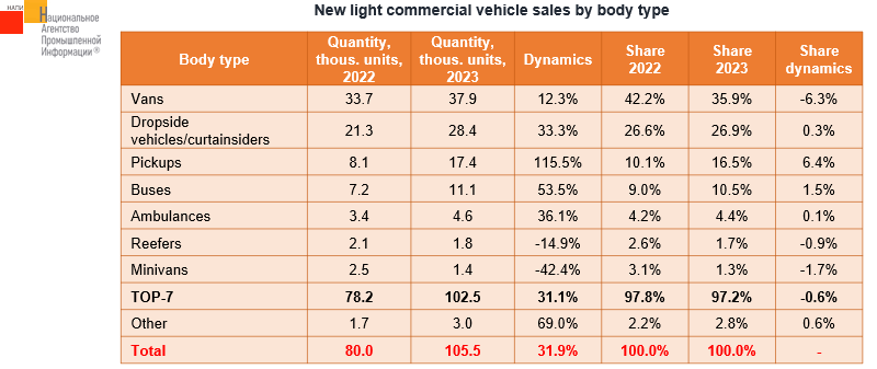 The marketing agency NAPI analyzed which types of light commercial vehicles* were in the greatest demand in 2023. Vans occupied the first place in the new vehicle market, having accounted for almost 36% of sales. The second place was taken by dropside vehicles/curtainsiders (almost 27% of the market), while pickups took the third place. Sales of pickups grew the most last year due to Chinese brands (+115.5% on 2022). Despite the fact that the entire light commercial vehicle market grew by 31.9%, sales of reefers and minivans decreased last year.
