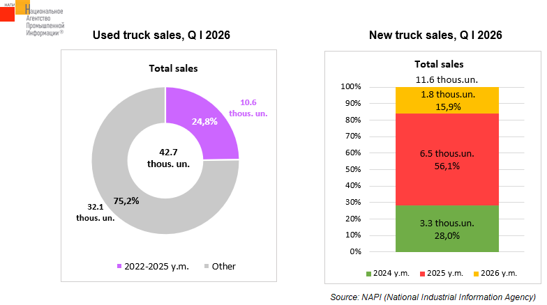 In the first quarter of 2026, sales of new and used trucks* decreased by 28.8% and 7.7%, respectively. Trucks manufactured in 2022-2025 accounted for almost a quarter of used truck sales. In terms of the number of "fresh" trucks sold (10.6 thousand units), this segment is only one thousand units behind new trucks (11.6 thousand units). Chinese brands made the largest contribution to the "fresh" used truck segment, accounting for 72% (7.7 thousand units). Trucks manufactured in 2022-2025 accounted for 83.6% of used Chinese truck sales.