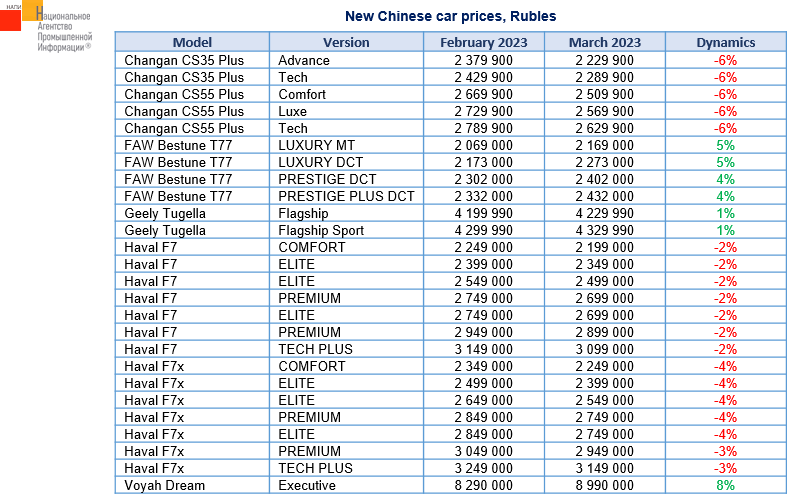 The marketing agency NAPI analyzed the recommended retail prices (RRP) for new Chinese cars in March 2023. Compared with February, prices for most models and versions remained unchanged. During the month, FAW Bestune T77 appreciated by 4-5%, depending on the version, Geely Tugella Flagship and Flagship Sport – by 1%, Voyah Dream in the version Executive – by 8%.