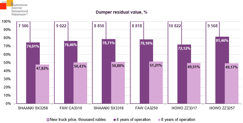 The marketing agency NAPI (National Industrial Information Agency) updated the «Truck residual value» report based on the results of Q IV 2023. Among the popular dumpers presented on the chart, HOWO ZZ3257 was a leader by residual value preservation after 4 years of operation: it retained 81.46% of the new dumper price. After 8 years of operation, FAW CA3250 became the leader with residual value of 51.21% of the new dumper price.
