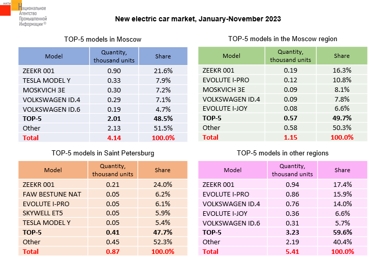 The marketing agency NAPI analyzed which new electric cars were sold better in the capital regions and in the rest of Russia. Following results of 11 months of the current year, the new electric car market in Moscow grew by 370.8%, the market in the Moscow region - by 387.2%, and that in Saint Petersburg - by 397.7%. Sales in other Russian regions soared by 485.6%. The Chinese ZEEKR 001 became the absolute leader in Moscow, the Moscow region, Saint Petersburg, as well as in other Russian regions. In Saint Petersburg, it accounted for almost a quarter of the local electric car market.