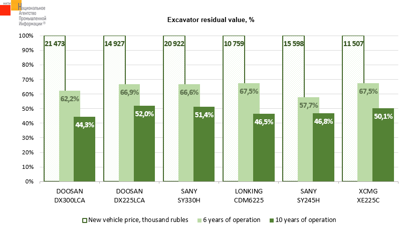 The marketing agency NAPI (National Industrial Information Agency) updated the "Special purpose vehicle residual value" report based on the results of Q II 2024. Among the excavators presented in the graph, LONKING CDM6225 and XCMG XE225C became the leaders by residual value preservation after 6 years of operation. Thus, having sold a six-year-old excavator, the owner could purchase a new LONKING CDM6225 or XCMG XE225C, paying additionally 32.5% of its price in Q II 2024. After 10 years of operation, DOOSAN DX225LCA became the leader: having sold it, the owner could purchase a new DOOSAN DX225LCA, paying additionally 48.0% of its price in Q II 2024.