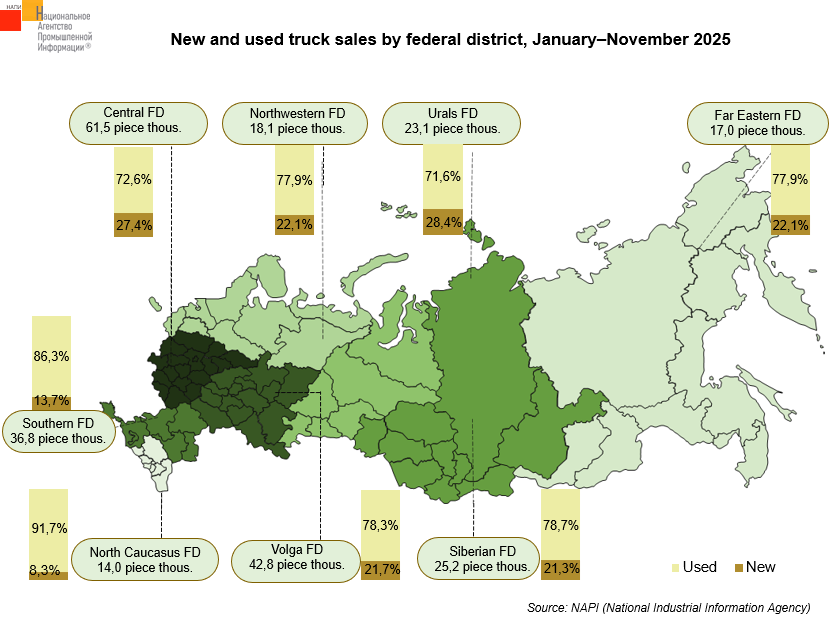 The largest number of trucks were sold in the Central Federal District (61.5 thousand units), the Volga Federal District (42.8 thousand units), and the Southern Federal District (36.8 thousand units).