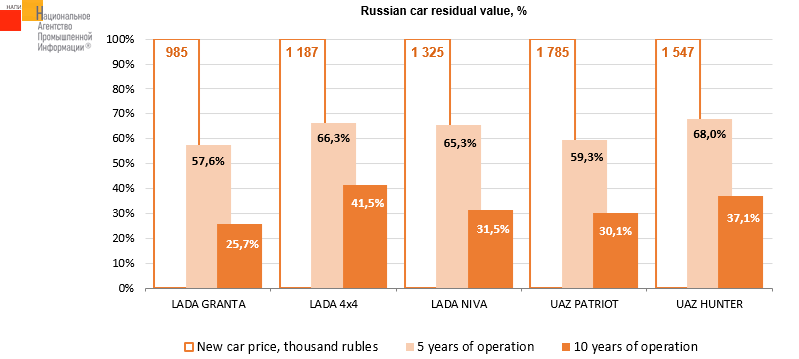 The marketing agency NAPI (National Industrial Information Agency) updated «The car residual value» report based on the results of Q I 2024. Among Russian cars presented on the chart, UAZ HUNTER remains the leader by residual value preservation after 5 years of operation. Thus, having sold a five-year-old car, the owner could purchase the new UAZ HUNTER, paying an additional 32% of its price in Q I 2024. After 10 years of operation, LADA 4X4 is in the lead: having sold it, the owner could purchase the new LADA 4X4, paying an additional 58.5% of the its price Q I 2024.