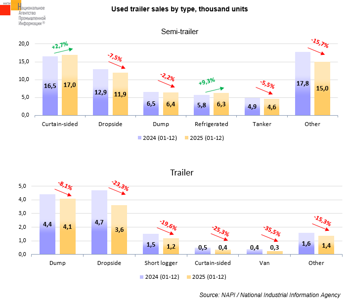 Used trailer sales declined even more sharply. Thus, 10.9 thousand used trailers were sold over 12 months of last year, which was a 17.2% decline on 2024. Sales of TOP-5 vehicles fell slightly below market levels (-17.5%). Sales of vans fell significantly (-35.5%), while the used dump trailer segment was slightly more stable, falling by 8.1%.