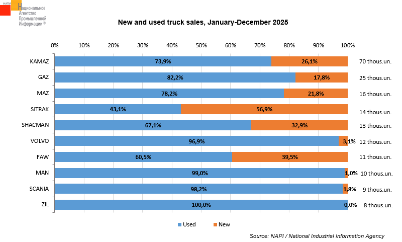 Over the year, the share of new trucks fell from 36.6% to 22.5% (-14.1 p.p.), while that of used ones grew from 63.4% to 77.5%. Among TOP-10 truck brands, used trucks account for the largest share of sales; only SITRAC (56.9%) has a higher share of new trucks. Used trucks account for the majority of total sales for the most Chinese trucks, despite they have relatively recently entered the Russian market.