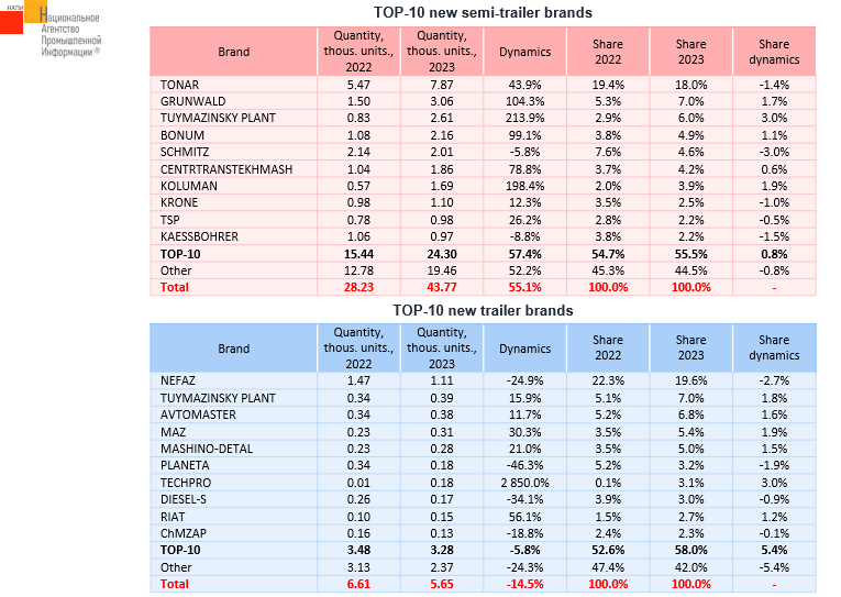 According to the marketing agency NAPI, in 2023, the new semi-trailer market grew by 55.1% and reached 43.77 thousand units. Following results of the year, TONAR remained the leader, but its share decreased to 18%. Sales of 5 brands included in TOP-10 grew significantly better than the market. The new trailer market fell by 14.5%. NEFAZ remained the leader following results of the year, but its share decreased to 19.6%.