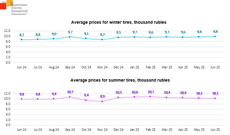 The marketing agency NAPI analyzed the dynamics of average prices for new tires for non-premium price segment cars. Over the year, from June 2024 to June 2025, the average price for winter tires increased by 13.3%, while that for summer tires grew by 2.6%.