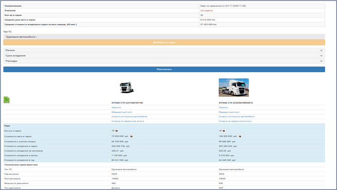 Or another example, already for trucks. The dealership was planning to upgrade its long-distance transportation vehicles, and it needed tractor units with various superstructures. Using the DV-TCO calculator, our client not only calculated the total cost of ownership of trucks of various brands, but also estimated the cost of traveling by these vehicles along specified routes due to the function of building an itinerary. So, the dealership selected the most profitable and suitable vehicle models for its tasks.