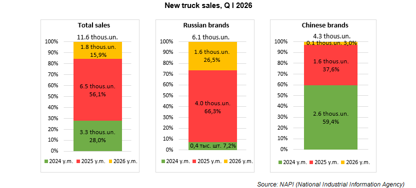In general, strong new vehicle sales in 2022-2024 and solid 2025 figures will continue to exert pressure on the market in 2026 and 2027. Firstly, early returned and withdrawn "fresh" vehicles offered at significant discounts continue to enter the market. Secondly, companies that purchased new vehicles in the aforementioned years and did not dispose of them will continue to operate them, as updating or expanding their fleets is not economically feasible. Thirdly, dealers have not yet sold out their stocks of new 2024-2025 vehicles. The situation in the first quarter of 2026 is as follows: vehicles manufactured in 2024 accounted for 59.5% of new Chinese truck sales, vehicles manufactured in 2025 accounted for 37.6%, and vehicles manufactured in 2026 accounted for less than 3%. Interestingly, vehicles manufactured in 2024 accounted for only 7.2% of Russian vehicle sales. Russian trucks manufactured in 2025 accounted for 66.3%, while those manufactured in 2026 - for 26.5%.