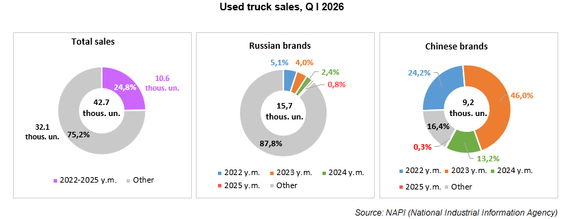 As for Russian vehicles, they account for 18.2% in "fresh" used truck sales. Analysis of the used Russian truck segment shows that older vehicles are being resold more often, while trucks manufactured in 2022-2025 account for only 12.3%. However, it should be noted that in 2022-2025, sales of new Russian vehicles were significantly lower than those of Chinese ones: 144.9 thousand units against 218.1 thousand units, respectively, meaning Chinese trucks were sold 50.5% more. In the first quarter of 2026, sales of used Chinese trucks of the same years of manufacture exceed those of used Russian trucks by 297%.