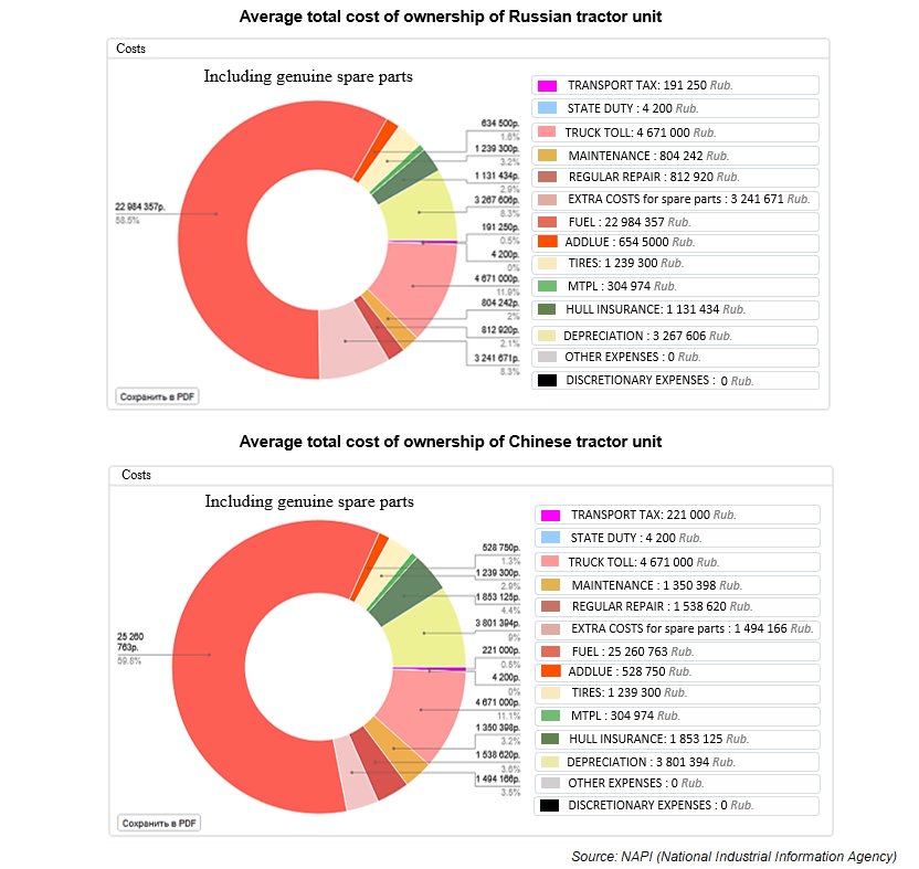 In challenging economic conditions, operation of Russian vehicles becomes more realistic: the price for a new truck is lower, meaning lower monthly lease payments and cheaper service and repair. For example, the average total cost of ownership of the Russian tractor unit is approximately 44 rubles per kilometer for five-year ownership period, excluding leasing costs, while that of the Chinese tractor unit is approximately 47 rubles per kilometer. Moreover, government support is provided for Russian vehicles, so owners are significantly less likely to discard their "fresh" Russian trucks than their more expensive Chinese ones.