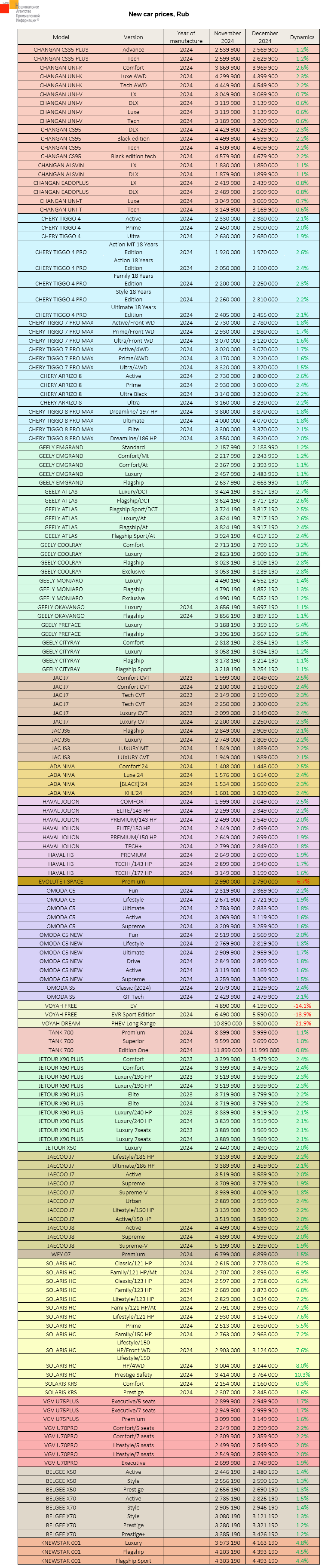 The marketing agency NAPI analyzed recommended retail prices (RRP) for new cars in December 2024. Compared to November 2024, prices for 158 versions changed. Prices for 4 EVOLUTE and VOYAH versions decreased. The price reduction varied from 6.7% to 21.9%. Prices for 154 CHANGAN, CHERY, GEELY, JAC, LADA, HAVAL, OMODA, TANK, JETOUR, JAECOO, WEY, SOLARIS, VGV, BELGEE, KNEWSTAR versions increased in December. The price increase varied from 0.3% to 10.3%.