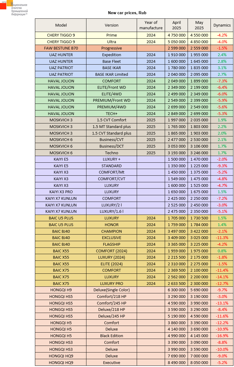 The marketing agency NAPI analyzed recommended retail prices (RRP) for new cars in May 2025. Compared to April 2025, prices for 51 versions changed. Prices for 37 CHERY, FAW, HAVAL, KAIYI, BAIC, and HONGQI versions decreased. The price reduction varied from 1.5% to 16.9%. Prices for 14 UAZ, MOSKVICH, KAIYI, and BAIC versions increased in May, the growth varied from 0.8% to 3.1%.