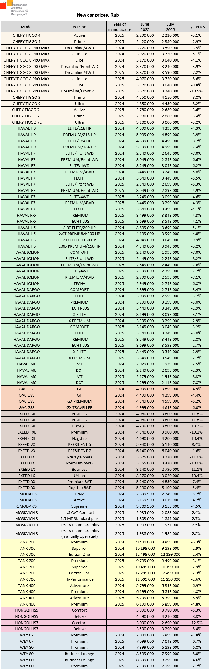 The marketing agency NAPI analyzed recommended retail prices (RRP) for new cars in July 2025. Compared to June of the current year, prices for 101 versions changed. The price reduction that varied from 0.7% to 12.9% affected 96 CHERY, HAVAL, GAC, EXEED, OMODA, TANK, HONGQI, and WEY versions. Prices for 5 EXEED and MOSKVICH versions increased from 2.4% to 3.4%. In July, HONGQI HS3 Comfort model depreciated the most (from 3,090,000 to 2,690,000 rubles). EXEED VX PRESIDENT 6 model appreciated the most (from 5,940,000 million to 6,140,000 rubles).