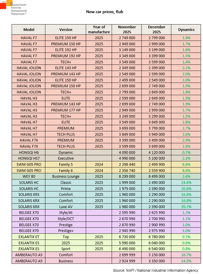 Price increased for versions of HAVAL, HONGQI, SWM, WEY, SOLARIS, BELGEE, EXLANTIX, and AMBERAUTO models. The growth varied from 0.7% to 24.6%.