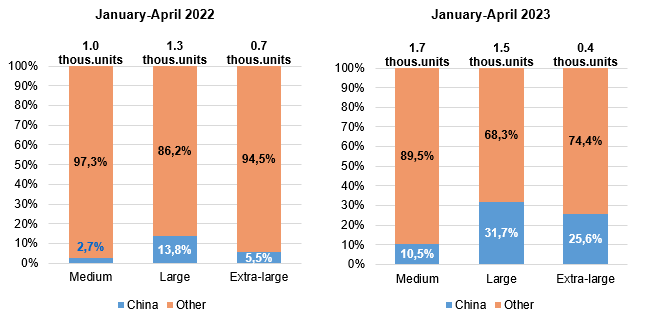 In the new bus market, the positions of Chinese brands are not so strong: following results of January-April of the current year, Chinese vehicles accounted for 13.8%. However, in the large (10-12 m) and extra-large (over 12 m) bus segments, their share is much higher – 31.7% and 25.6%, respectively.