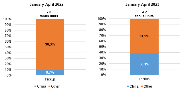 The new light commercial vehicle market has not been very interesting to Chinese manufacturers for a long time: following results of 4 months of the last year, they accounted for only 1%. Over the year, the share of Chinese brands has not increased so much: in January-April 2023, it reached 7.4% of the market. Pickups are mainly supplied to the Russian market; Chinese vehicles occupied 38.1% in the new pickup sales this year.