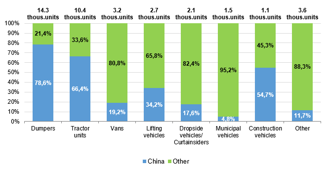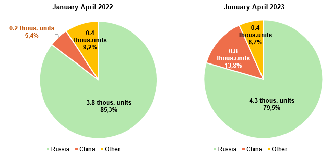 Chinese manufacturers have achieved the most significant success in the truck segment, where they occupied 54.3% of the market, following results of four months of the current year, taking the palm from Russian manufacturers. It is noteworthy that the share of Chinese brands in the new dumper market has already reached 78.6%. In the tractor unit market, where there was no Chinese vehicles until February 24, 2022, they occupied 66.4%.