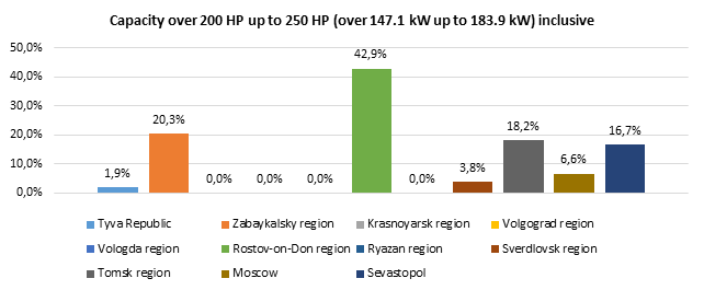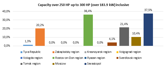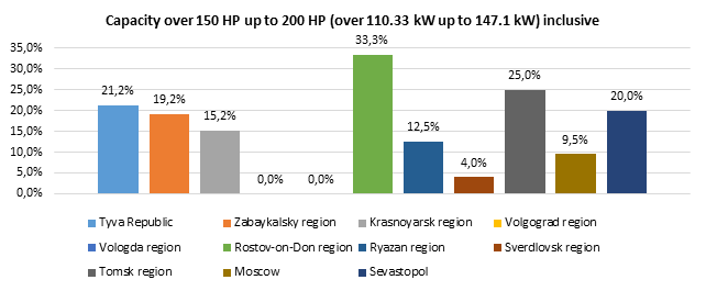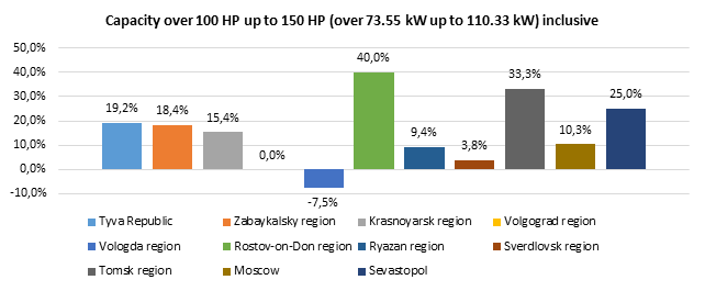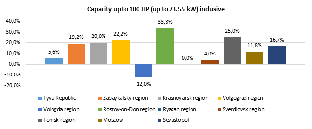 The largest increase in rates for vehicles of all the capacities considered below took place in the Rostov-on-Don and Tomsk regions. Rates decreased only in the Vologda region for vehicles with engines capacity up to 100 HP (up to 73.55 kW) inclusive and engines capacity over 100 HP up to 150 HP (over 73.55 kW up to 110.33 kW) inclusive.