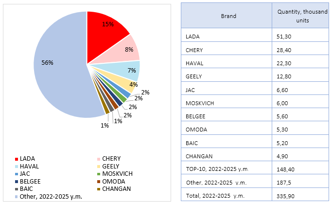 LADA is the most in-demand brand in the taxi population: it accounts for 15% of the new car population. Thus, there are 51.3 thousand LADA cars of 2022 - 2025 years of manufacture used as taxi. CHERY is on the second place by popularity: the brand owns 8% of the new taxi population (28.4 thousand cars). HAVAL occupied the third place, with 22.3 thousand cars of this brand registered in taxi companies, which is 7% of the population. TOP-10 also includes GEELY, JAC, MOSKVICH, BELGEE, OMODA, BAIC, and CHANGAN cars. The TOP-10 leaders account for slightly less than half of the fresh taxi population in Russia (44%).