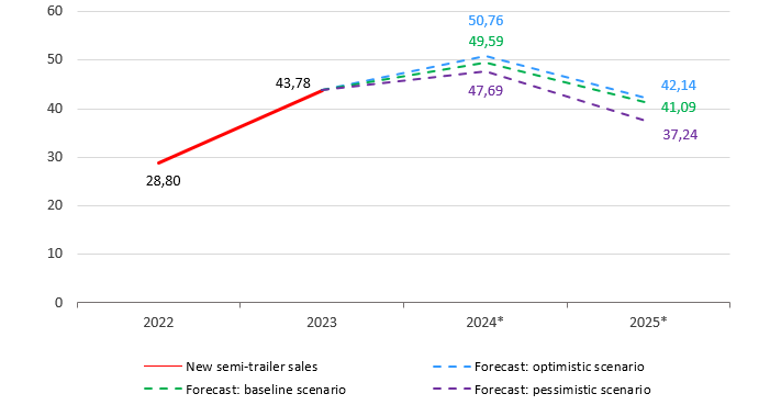 | Sales forecast, scenario | Semi-trailer sales forecast in 2024, thousand units | Growth/loss, 2024/2023, % | Semi-trailer sales forecast in 2025, thousand units | Growth/loss, 2025/2024, % |