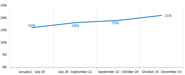 2. High loan and leasing interest rates. Since the beginning of 2024, there has been a gradual increase in the key rate of the Central Bank of the Russian Federation (see chart). The last increase in the key rate took place on October 25, 2024. The Central Bank of the Russian Federation raised the key rate to 21%. This rate is valid until February 14, 2025. With the growth of the key rate, the loan and leasing interest rates increased, which made these financial instruments less affordable. The negative impact of high leasing and loan interest rates will remain until the end of 2024 and in 2025. Leasing and loan interest rates will depend on the key rate of the Central Bank of the Russian Federation, which may be increased in 2025.