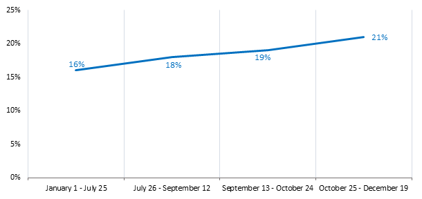 2. High loan and leasing interest rates. Since the beginning of 2024, there has been a gradual increase in the key rate of the Central Bank of the Russian Federation (see chart). The last increase in the key rate took place on October 25, 2024. The Central Bank of the Russian Federation raised the key rate to 21%. This rate is valid until December 19, 2024. On December 20, a meeting of the Board of Directors of the Bank of Russia will be held, which will consider the issue of the further level of the key rate. With the growth of the key rate, the loan and leasing interest rates increased, which made these financial instruments less affordable. The negative impact of high leasing and loan interest rates will remain until the end of 2024 and in 2025. Leasing and loan interest rates will depend on the key rate of the Central Bank of the Russian Federation, which may be increased after December 20, 2024.