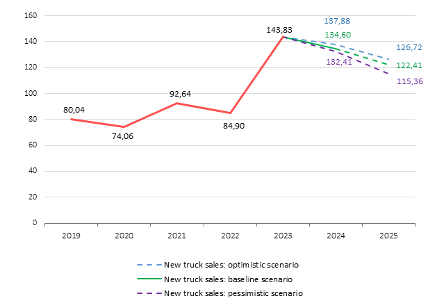 The new truck market forecast (vehicles with GVW over 6 tons) is based on three scenarios: baseline, optimistic and pessimistic.