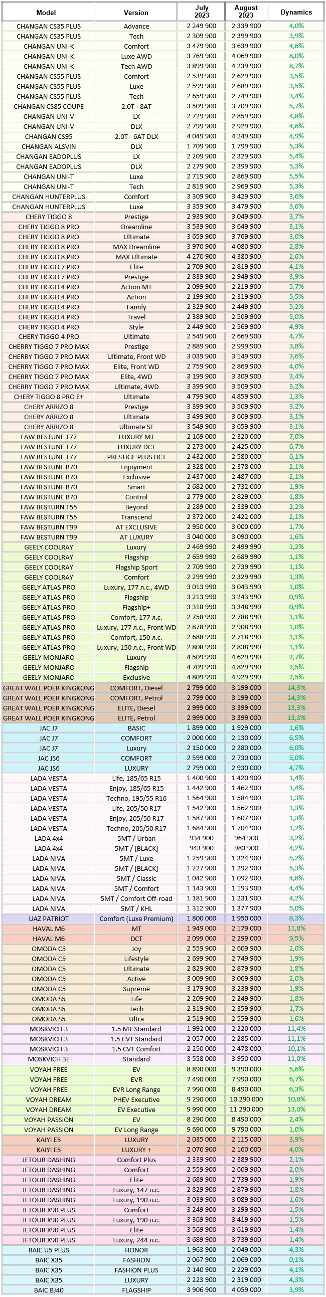 The marketing agency NAPI analyzed recommended retail prices (RRP) for new cars in August 2023. On August 1, 2023, recycling tax coefficients sharply grew, which resulted in the further increase in car prices. In August, prices for 127 car vesrions increased on July, cars appreciated by 0.1-14.3%. In July, only 52 vesrions appreciated on June.