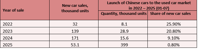 In 2022, 32 thousand new Chinese cars were sold to corporate clients, of which 25.9% of cars entered the used car market during the period from 2022 to January-July 2025. Similarly, in 2023 - 139 thousand cars and 20.8%, in 2024 - 171 thousand cars and 9.1%. Since the beginning of the current year, 53.1 thousand new Chinese cars have been purchased, the share of resale was 0.8%.