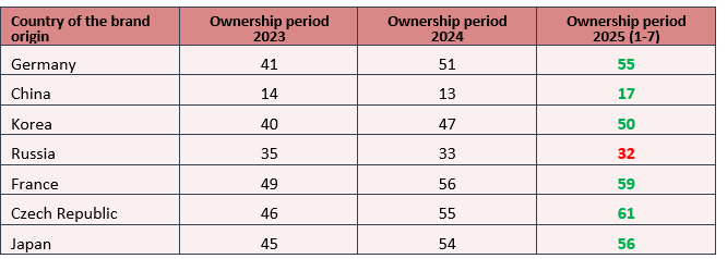 In January-July of the current year, the ownership periods of cars of German (55 months), Korean (50 months), French (59 months), Czech (61 months) and Japanese (56 months) brands increased. Beginning 2022, fleets have begun to actively purchase and operate Chinese cars, the ownership period has increased to 17 months. At the same time, the ownership period of Russian brand cars decreased from 35 months in 2023 to 32 months over the first seven months of the current year.