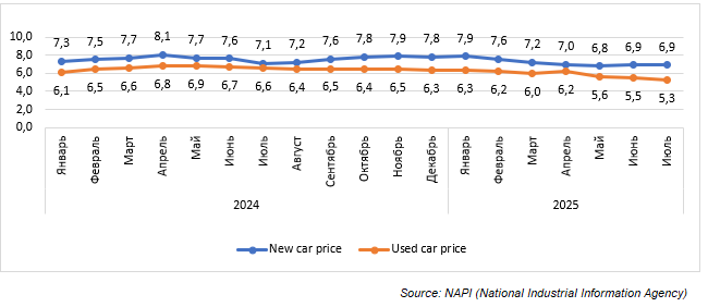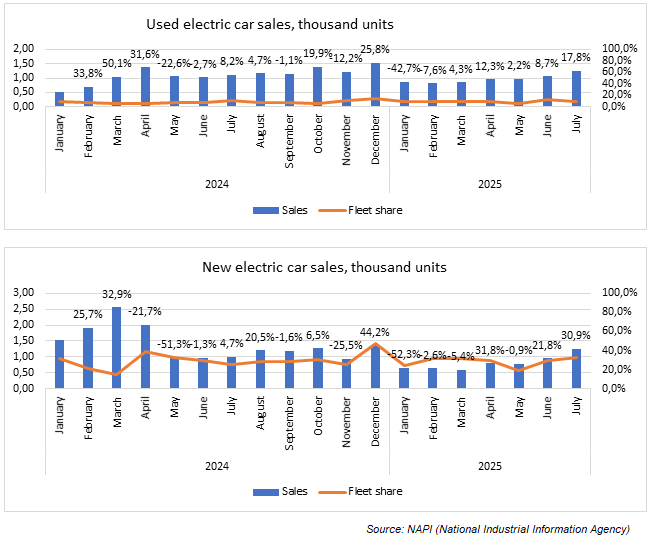 Also, 5.7 thousand new electric cars were sold over the first seven months of 2025, which was a 48.2% decline on the last year. Used electric car sales fell by only 1.2% to 6.7 thousand units. In July, new electric car sales grew by 30.9% on the previous month, those of used ones - by 17.8%. In January 2024 - July 2025, the share of corporate clients in total used electric car sales varied from 5.3% to 12.2%, new ones - from 15.1% to 47.6%.