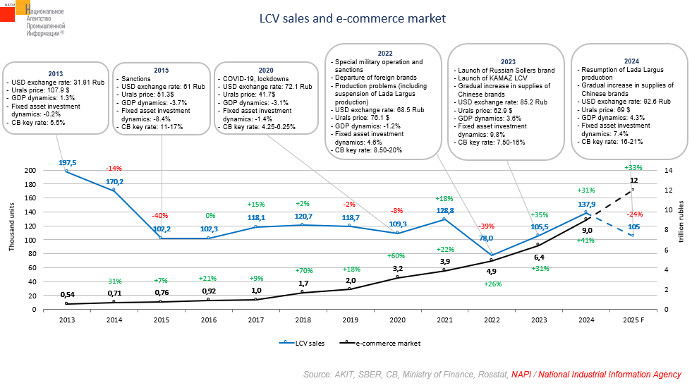 So what's been happening with e-commerce all this time? It's been growing steadily. According to AKIT and SBER, the e-commerce market grew from 544 billion rubles in 2013 to 9 trillion rubles in 2024. It would seem that such growth in e-commerce should have led to increased demand for LCV for urban delivery. However, there is no clear correlation between these factors. For example, in 2018, the e-commerce market grew by 70%, while LCV sales only increased by 2%. And in 2022, LCV sales collapsed, despite the e-commerce market grew by 26%.