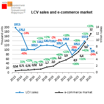 According to forecasts, the e-commerce market could exceed 12 trillion rub. by 2025, which will be a third rise on the previous year. However, LCV sales will decline this year due to expensive leasing and auto loans, a cooling of business from buyers of vehicles in other segments, and other factors… In summary, no matter what level e-commerce reaches, LCV sales will unlikely reach the 2013 level.