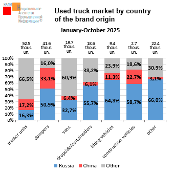 According to the NAPI, 66.8 thousand used trucks* were sold in Jan-Oct 2025, which was a 5.7% decline on the previous year, when 176.9 thousand trucks were sold. Sales of used Russian vehicles decreased by 7.1% year-on-year to 69.0 thousand units. Sales of used Chinese trucks, on the contrary, grew by 47.6% to 27.6 thousand units…