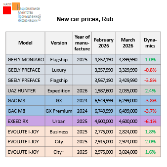 The marketing agency NAPI analyzed recommended retail prices (RRP) for new cars in March 2026. Compared to February of the current year, prices for 24 versions changed. Prices for 7 versions of GEELY, GAC, EXEED, and OMODA models decreased. The price reduction varied from 0.8% to 10.8%…