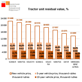 The marketing agency NAPI has updated its “Tractor unit residual value» report for Q IV 2025. Among five-year-old tractor units shown in the graph, SCANIA G could be sold at the highest price last quarter: its average price was 9.7 million rubl. Among ten-year-old tractor units , VOLVO FH was offered at the highest price: 6.5 million rubl…