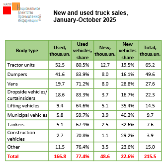 According to the NAPI, 215.5 thousand new and used trucks* were sold in (01-10) 2025, which was a 23.7% decline on the 2024, when 282.5 thousand trucks were sold. So, used truck sales decreased by 5.7%, while sales of new vehicles fell by 53.9%. New vehicle sales more than halved over the year: tractor units (-71.1%), dumpers (-58.5%), dropside vehicles/curtainsiders (-56%), and construction vehicles (-50.5%)…